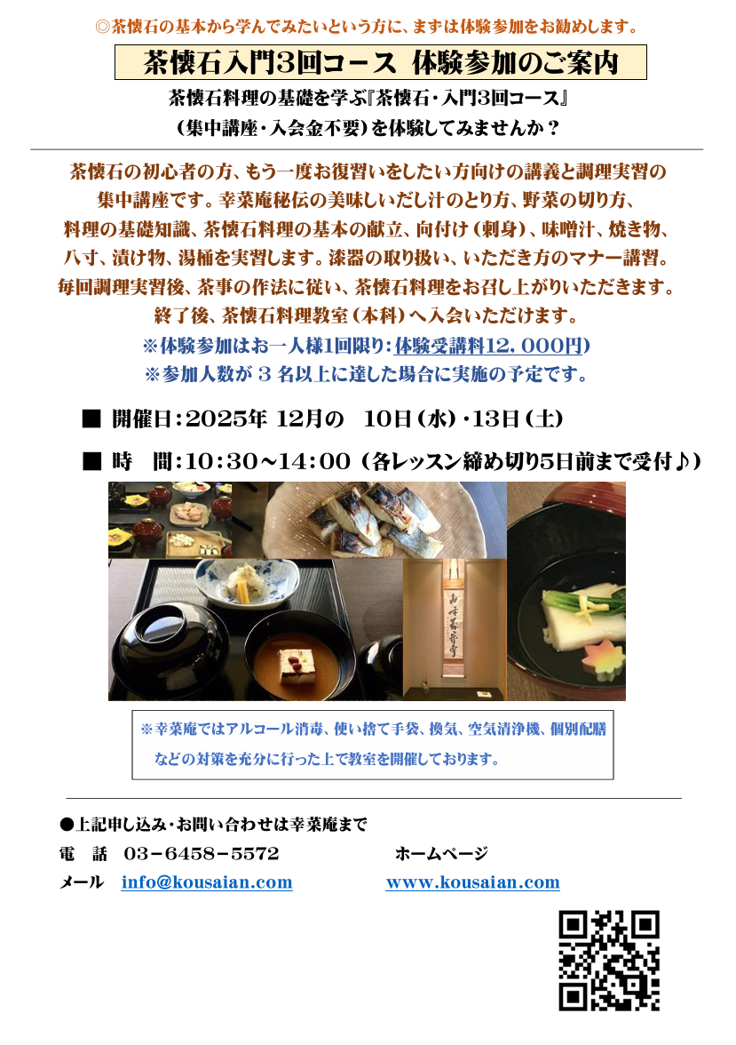 2025年12月(師走)茶懐石料理教室 茶懐石(本科)・茶懐石入門3回コース 体験参加ご案内