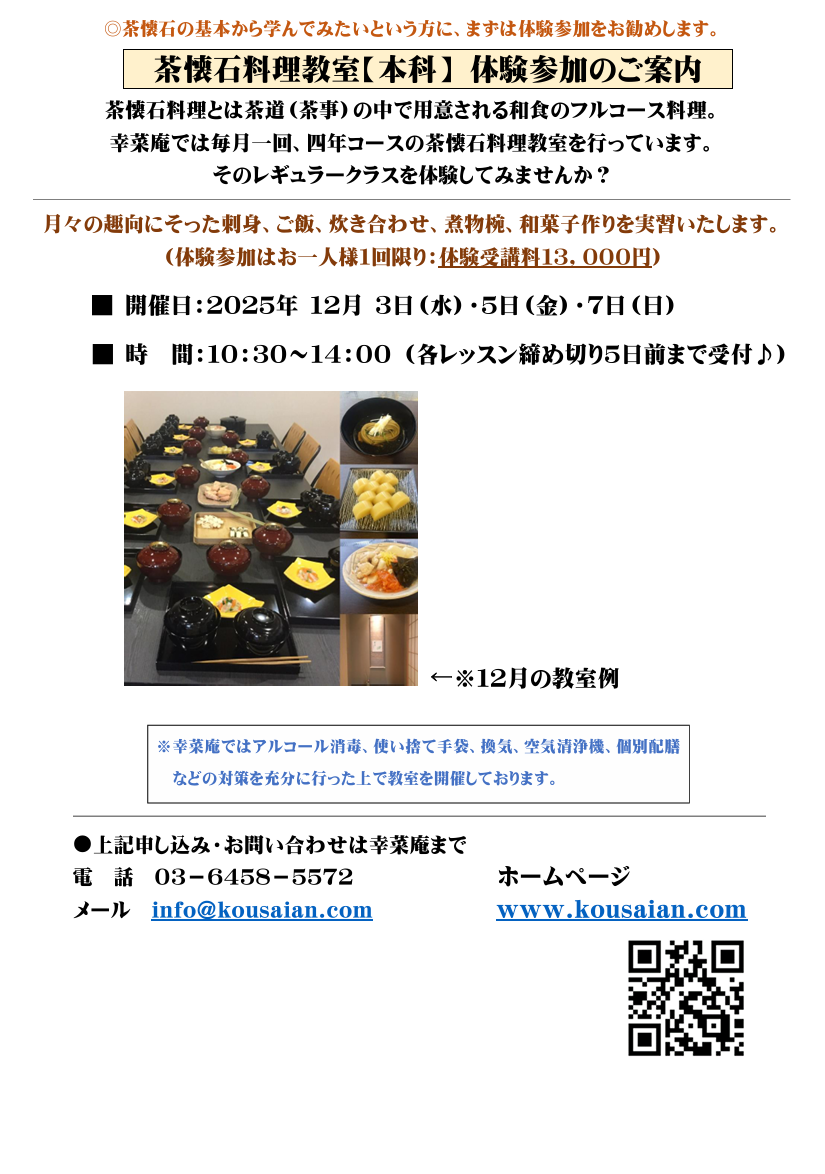 2025年12月(師走)茶懐石料理教室 茶懐石(本科)・茶懐石入門3回コース 体験参加ご案内です。