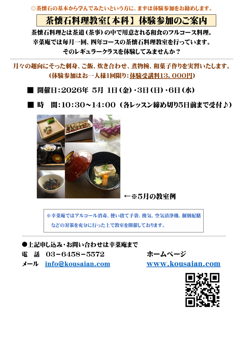 2026年5月(皐月)茶懐石料理教室 茶懐石(本科)体験参加ご案内です。